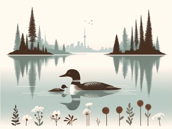Bathed in serene tones and a palette that speaks of tranquility and natural beauty, an enchanting scene unfolds on the still waters of Ontario. An adult loon, accompanied by its two chicks, glides effortlessly across a mirror-like lake, their reflections mingling with the gentle ripples of the water. In the background, the iconic silhouette of Toronto's skyline, including the distinctive CN Tower, rises majestically, bridging the gap between urban splendor and rustic charm. This minimalist artwork captures the essence of Canadian wildlife coexisting with urban development, portrayed through a dreamy lens of soft grays and muted earth tones. The surrounding flora, depicted in simplistic yet elegant detail, adds a touch of whimsy to the composition, while distant birds in flight suggest a narrative of migration and freedom. *** About Loons: Loons are iconic birds in Canada, known for their eerie calls and impressive diving abilities. Found commonly on lakes across northern America, loons are distinguished by their striking black and white plumage and red eyes. Adults typically measure about 66 to 91 cm in length and are excellent swimmers, using their webbed feet to propel through water in search of fish. The loon’s haunting calls vary from wails to tremolos and are a definitive sound of the wilderness. As a migratory bird, the loon represents resilience and adaptation, embodying the spirit of wild Canada. In many cultures, loons hold a place of respect and admiration, often associated with wilderness and solitude. :