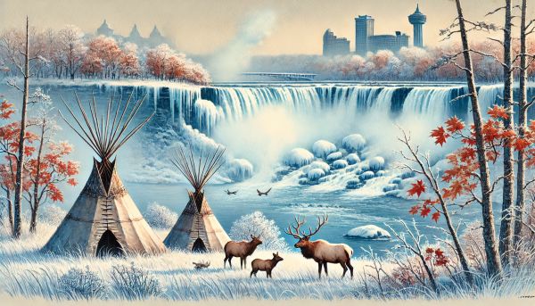 Bathed in the soft glow of a seasonal shift, this stunning ink wash painting reinterprets Niagara Falls amidst the delicate balance of winter and fall. The artwork immerses viewers in a serene landscape where the mighty falls cascade with a quiet intensity, their mist rising to meet the frost-laden air. In the foreground, traditional teepees rest along the water's edge, painted with an attention to detail that conveys both reverence and authenticity. Flora in shades of fiery autumn red and icy winter blue frame the scene, enhancing the natural drama of the transition between the cold and warmer months. Adding life to this peaceful scene, a pair of majestic deer meanders along the riverbank, perfectly at ease in their picturesque surroundings. The composition masterfully blends elements of traditional Japanese aesthetics with a quintessentially North American landmark, creating a cross-cultural homage that appeals to art lovers and collectors worldwide. *** About Niagara Falls: *** Niagara Falls, located on the border between Canada and the United States, is one of the most awe-inspiring natural wonders of North America. With more than six million cubic feet of water plunging over the crest every minute, it presents a breathtaking sight. This marvel is not only a popular tourist destination but also an important source of hydroelectric power, and is steeped in a rich history that includes indigenous heritage, folklore, and pioneering industrial developments.