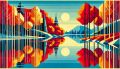Autumn Whirl: Vivid Red Maples and Traditional Tipis by a Serene Lake