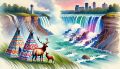 Vibrant Ink Wash Illustration of Niagara Falls with Native Elements