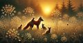 Mother Fox and Kits in Sunrise Meadow: A Japanese Ink Art Representation