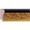 An ornate, solid wood frame featuring an intricate design overlaid with elegant gold leaf, and lightly antiqued. A shallow scooped profile and unadorned inner edge draw the eye inward. A dark brown outer edge highlights the design.