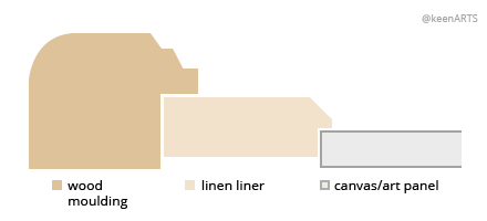 Liners (also called linen liners) are fabric-covered mouldings, used inside the outer moulding in a frame design. A liner is not completely finished, so it would not be used as the only moulding for a frame. Liners often are used in place of mats on framed canvas prints or oil paintings that do not require glass.